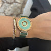 Die Bella Gold Green Damenuhr von Magneto Watch vereint zeitlose Eleganz mit einem Hauch von Luxus. Ihr edles grün-goldenes Zifferblatt harmoniert perfekt mit dem goldfarbenen Gehäuse aus hochwertiger Alloy, während das Satin-Lederarmband in Grün den femininen und stilvollen Look abrundet. Gehäusedurchmesser: 36 mm, Gehäusehöhe: 10,5 mm. Perfekt für Frauen, die klassische Schönheit und exklusive Details schätzen.