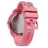 Das robuste Kunststoffgehäuse (ABS) ist angenehm leicht, während das pinke Silikonarmband mit blasenartigem Print an Seifenblasen erinnert.