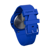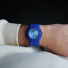 Ein besonderes Highlight ist die Datumsanzeige zwischen 10 und 11 Uhr – eine ungewöhnliche Position, die Blicke auf sich zieht und für Gesprächsstoff sorgt. Dazu harmoniert das rundgebürstete Aluminium-Zifferblatt, das dezente Lichtreflexe erzeugt. Komplettiert wird der Look durch das blaue Silikonarmband mit erhabener „La Montre“-Prägung und Dornverschluss, das für hohen Tragekomfort sorgt.