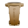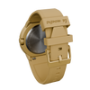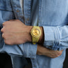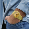 Ein besonderes Highlight ist die Datumsanzeige zwischen 10 und 11 Uhr – eine ungewöhnliche Position, die Blicke auf sich zieht und für Gesprächsstoff sorgt. Dazu harmoniert das rundgebürstete Aluminium-Zifferblatt, das dezente Lichtreflexe erzeugt. Komplettiert wird der Look durch das gelbe Silikonarmband mit erhabener „La Montre“-Prägung und Dornverschluss, das für hohen Tragekomfort sorgt.